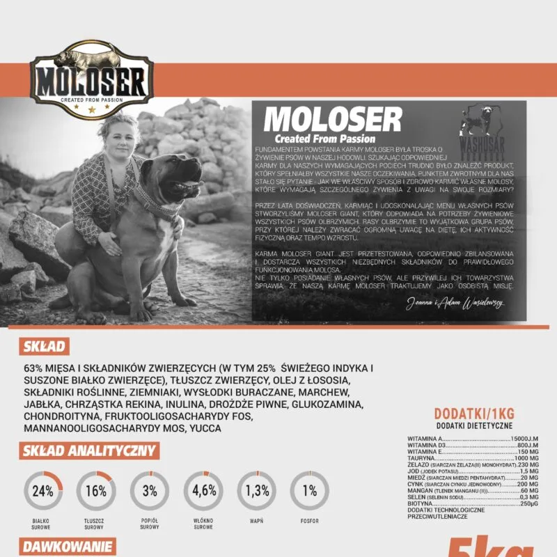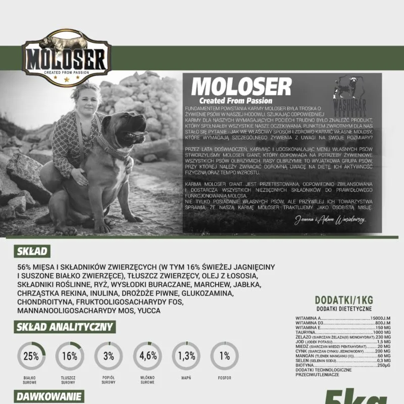 Formuła została wzbogacona o glukozaminę, chondroitynę i chrząstkę rekina, które wspierają stawy i kości – szczególnie ważne u większych ras. Inulina, FOS i MOS pomagają utrzymać zdrową florę jelitową, a Yucca ogranicza nieprzyjemny zapach odchodów. Całość dopełnia zestaw witamin i minerałów dla wzmocnienia odporności i witalności.