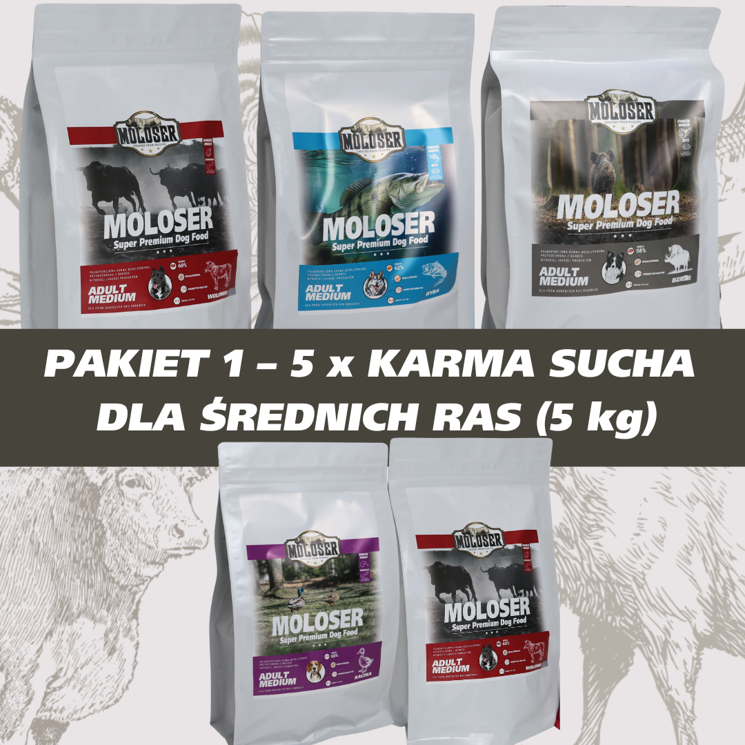 Pakiet 1 – 5 x karma sucha dla średnich ras (5 kg)